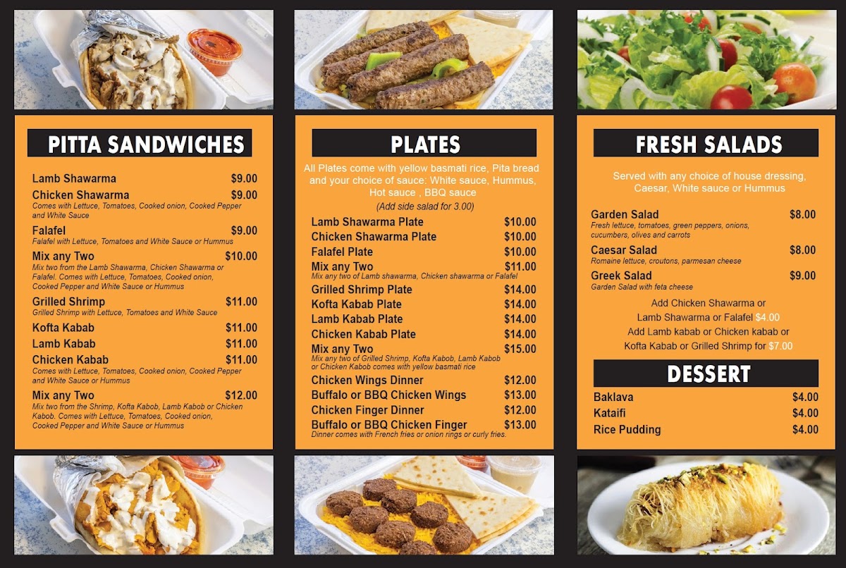 Yellow Basmati rice and Lamb Shawarma served with pita bread and your choice of sauce: White sauce, Hummus, Hot Sauce, BBQ.